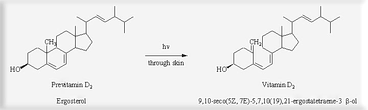 Ultraviolet irridiation of a variety of this animal and plant sterols results in the conversion of provitamins to compounds with vitamin D activity. Ergosterol, which is derived from plants, can be converted into ergocalciferol otherwise known as calciferol (vitamin D2) with the aid of ultraviolet irridiation (see diagram below). For instance, vitamin D was once made available in commercial quantities when vitamin D2 was manufactured by irridiation of ergosterol derived from yeast.